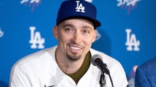 ドジャースのユニフォームに袖を通したスネル。来季はローテーションの柱として期待される(C)Getty images 早く…