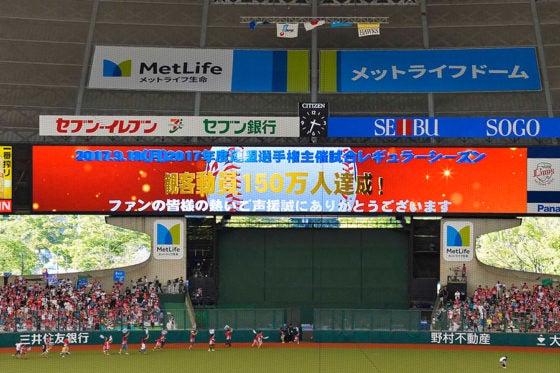 観客動員数150万人突破を祝う西武ドームのビジョン【写真提供:埼玉西武ライオンズ】
