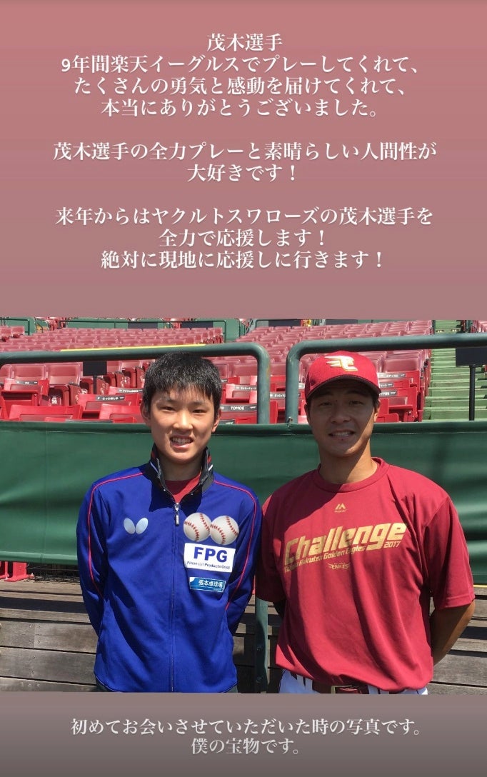 「9年間楽天イーグルスでプレーしてくれて、たくさんの勇気と感動を届けてくれて、本当にありがとうございました。茂木選手の全力プレーと素晴らしい人間性が大好きです!来年からはヤクルトスワローズの茂木選手を全力で応援します!絶対に現地で応援しに行きます!」と語った。
