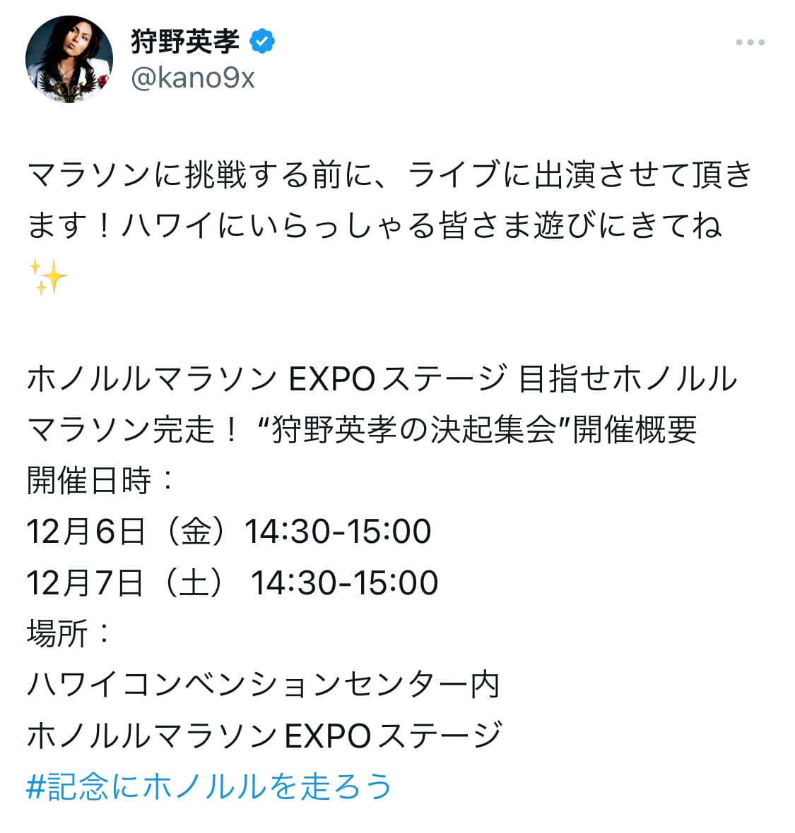 狩野英孝、#記念にホノルルを走ろうにライブ出演!ファンから応援メッセージ続々! | 話題の投稿