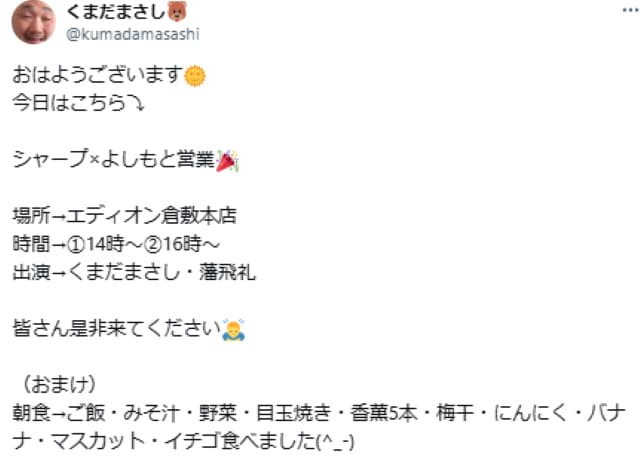 芸人のくまだまさしが7日、Xを更新した。【画像】お笑い芸人 くまだまさし、5年間、演劇部を頑張った娘に「お疲れ様ね」と労…