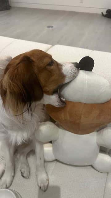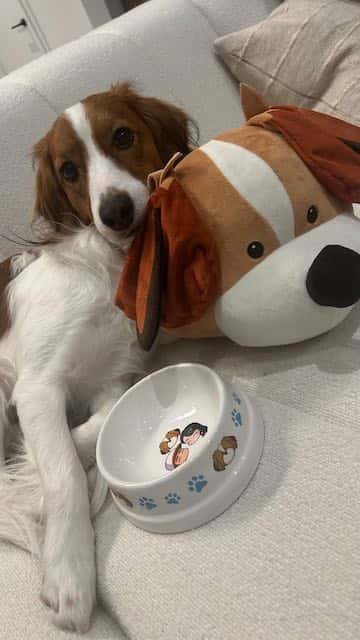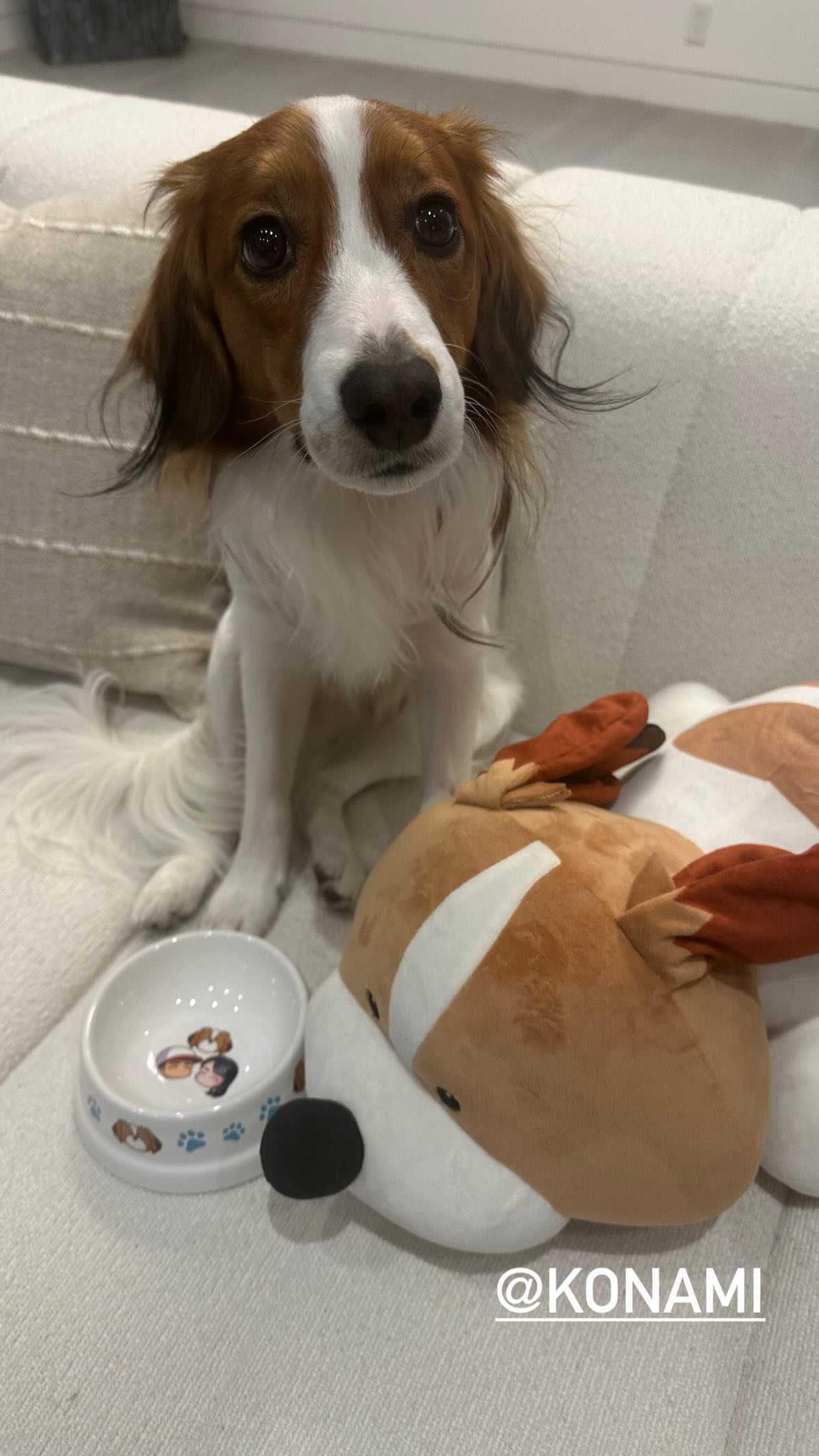 愛犬の「デコピン」の様子を公開した大谷。デコピンがぬいぐるみとじゃれたり、一緒に寝ており、エサ皿には大谷とデコピンそして真美子夫人と思われるイラストが描かれている。