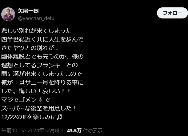 矢尾一樹、フランキー役卒業を報告「悔しい!哀しい!」 ファンに感謝と次代への期待 | 話題の投稿