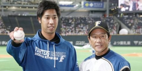 プロ初勝利を挙げ、栗山監督(右)と記念撮影する日本ハム・吉田=札幌ドーム【写真提供:共同通信社】北海道日本ハムの2年目右…