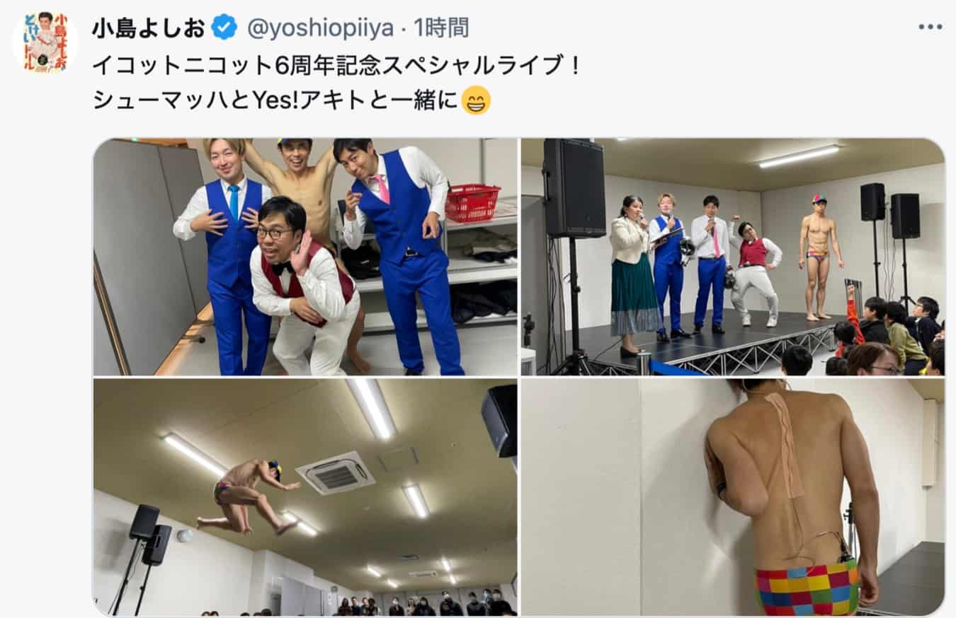 12月8日、小島よしおが公式Xでイコットニコット6周年記念ライブに参加したことを報告。「シューマッハとYes!アキトと一…