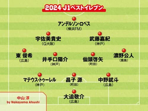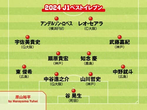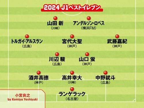 年間ベストイレブンを選出するにあたっては、今シーズンのチーム成績を加味。そのため、必然的に最後まで優勝争いを繰り広げた3チーム、ヴィッセル神戸、サンフレッチェ広島、FC町田ゼルビアの選手が多数を占めることとなった。