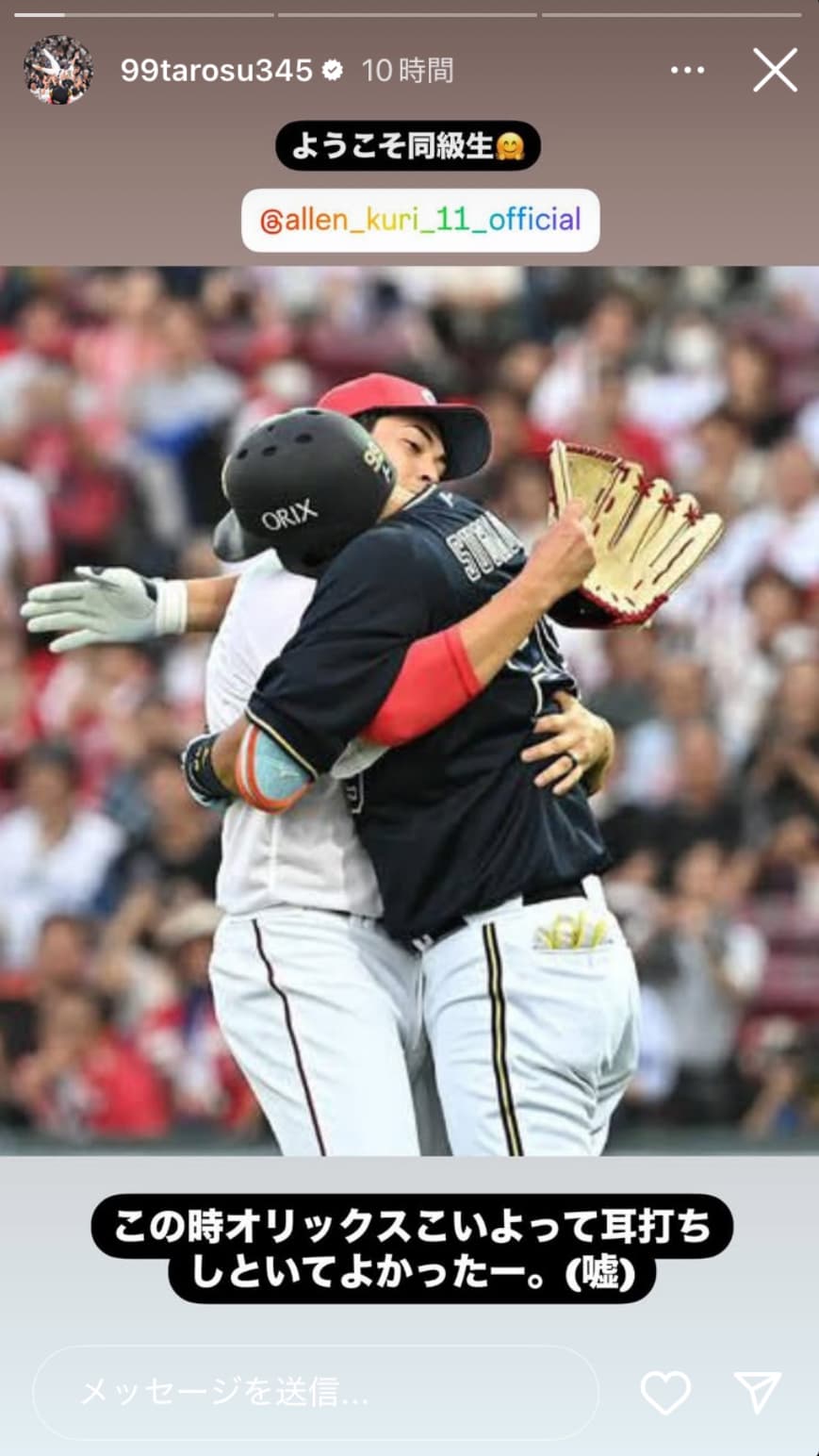 「ようこそ同級生」と綴り、オールスターでの九里との一幕を投稿。