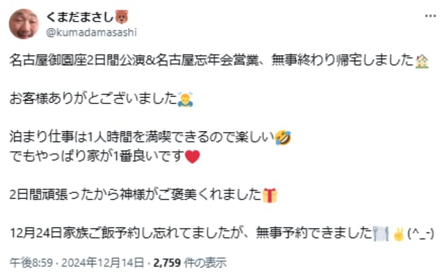 くまだまさし、クリスマスイヴに家族との食事会を忘れていたが「無事予約」と喜びの声 | 話題の投稿