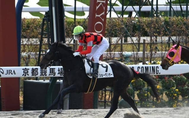 15日、京都競馬場6Rで行われた新馬戦(2歳・ダ1800m・16頭)は、中団追走から直線で突き抜けた国分優作騎手騎乗の9番人気ショーダンサー(牡2、栗東・大根田裕之厩舎)が、2番手から一旦は先頭に立った1番人気ハグ(牡2、栗東・藤岡健一厩舎)に2馬身差をつけ優勝した。勝ちタイムは1分54秒8(良)。