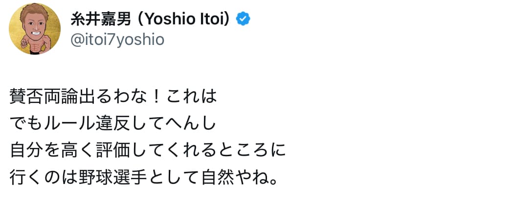 元プロ野球選手・糸井嘉男 自論語る「賛否両論出るわな!」 | 話題の投稿