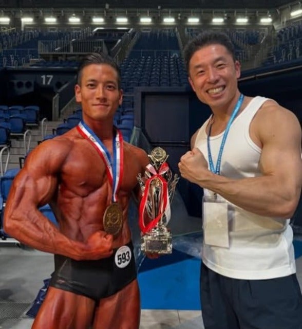 なかやまきんに君がボディビル・フィットネス世界大会で優勝した五味原領選手とムキムキツーショット!