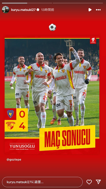 トルコ1部のギョズテペに所属する松木玖生がが20日、自身のインスタグラムのストーリーを更新した。