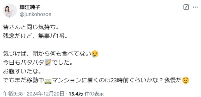 「皆さんと同じ気持ち。残念だけど、無事が1番。 気づけば、朝から何も食べてない 今日もバタバタでした。お腹すいたな。でもまだ移動中マンションに着くのは23時前ぐらいかな?我慢だ」と綴った。22日に行われる有馬記念で断然の1番人気に支持され武豊騎乗のドウデュースが怪我のため出走を取り消したことで有馬記念は混戦ムードが漂っている。なお、ドウデュースは、これが引退レースとなる予定だった。