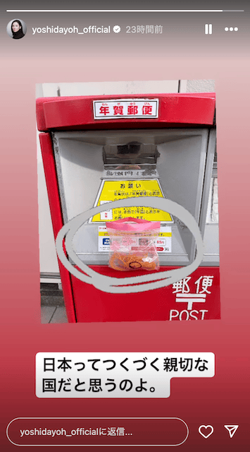 「日本ってつくづく親切な国だと思うのよ。」と綴り、1枚の写真を投稿した。