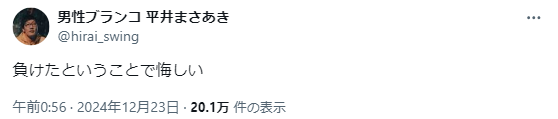 お笑いコンビ・男性ブランコの平井まさあきが23日に自身のXを更新。悔しい胸中を吐露した。【画像】人生初のドッキリ!!の元…