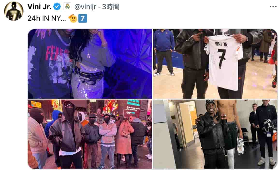 レアル・マドリード所属のヴィニシウスが27日、公式Xを更新。「24h IN NY 🫡7️⃣」とコメントを添え、ニューヨー…