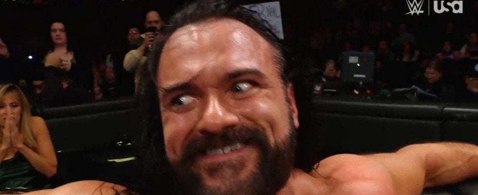 問題のシーンで一番象徴的だったのはリングサイドの女性のリアクション。手を合わせて「オーマイガー」と絶句する姿と、狂気のドリューの”サイコ度マックス”バッキバキの目と笑顔がシュール過ぎる。