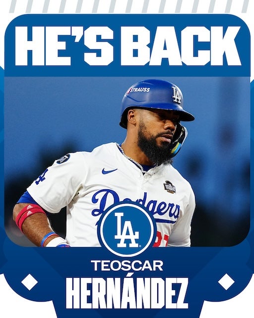 「Dodgers, OF Teoscar Hernández agree to 3-year deal with a team option for 2028, per multiple reports including http://MLB.com's @Feinsand.(ドジャース、OFテオスカー・へルナンデスと2028年のチームオプション付き3年契約で合意。http://MLB.com を含む複数の報道。@Feinsand)」と綴り、1枚の写真をアップ。
