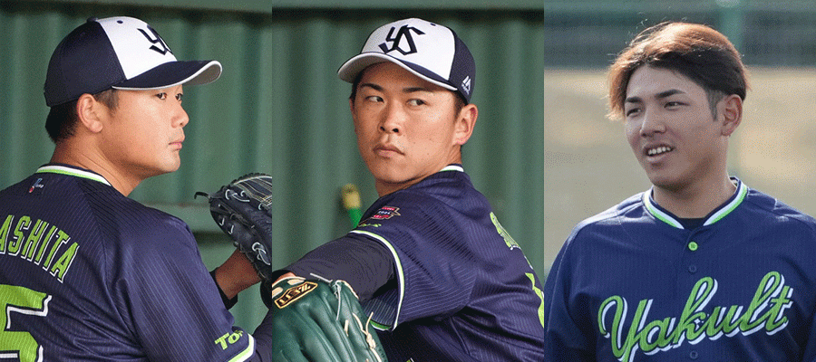 ヤクルト・山下輝、楽天に移籍した柴田大地、小森航大郎(左から)【写真:小林靖】