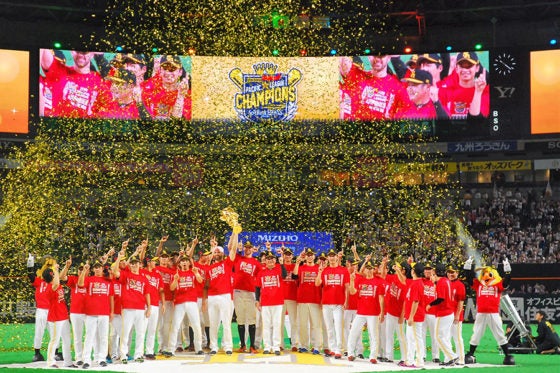 その後、新調された優勝トロフィー、優勝ペナント、優勝旗を受け取ると、優勝を祝う20発の花火の後、選手たちはグラウンドを1周。最後にマウンドに戻ると、MVP候補のサファテが優勝トロフィーを高々と掲げ、全員で改めてリーグ優勝を喜び合った。(藤浦一都 / Kazuto Fujiura)