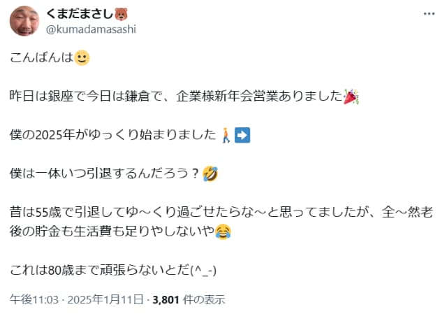 くまだまさし、55歳で引退を考えるも「老後の貯金も生活費も足りない」と80歳まで頑張ると決意! | 話題の投稿