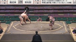 <大相撲一月場所>◇初日◇12日◇東京・両国国技館【映像】力士が突如後ろに倒れる“異変”に騒つく館内 攻めてるはずが一気…