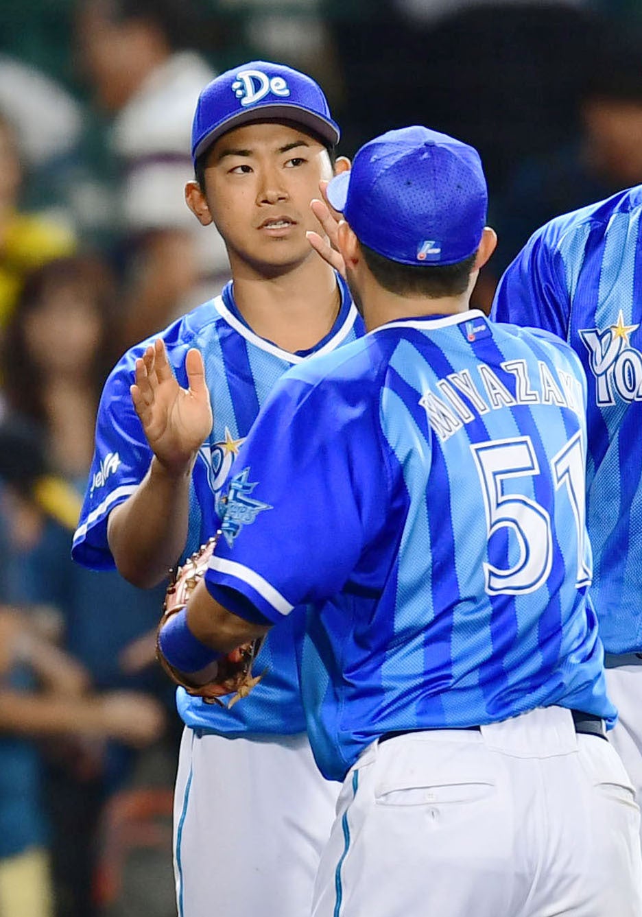 11勝目を挙げ、宮崎(手前)とタッチを交わすDeNA・今永=甲子園【写真提供:共同通信社】