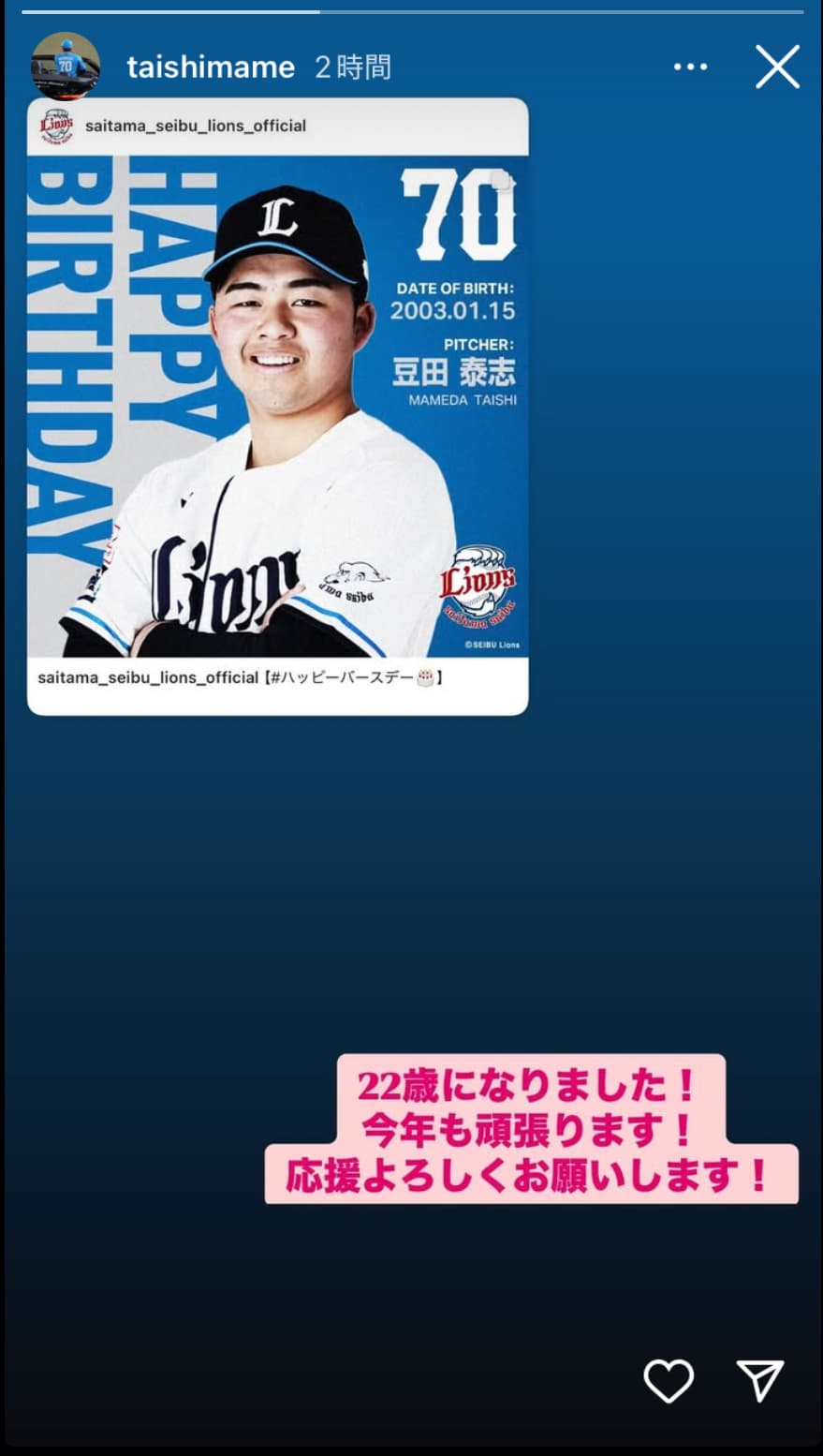 西武の豆田泰志が15日、自身のインスタグラムのストーリーを更新した。