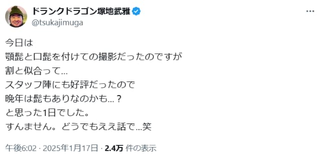 ドランクドラゴン塚地、顎髭と口髭を付けての撮影も「その写真は…」とファン困惑 | 話題の投稿