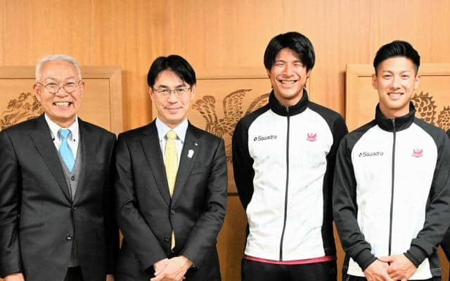 社会人サッカークラブ「飛鳥FC」の選手らが22日、奈良県庁を訪れ、山下真知事に日本フットボールリーグ(JFL)への昇格を報告した。