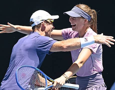 テニスの全豪オープン(オーストラリア/メルボルン、ハード、グランドスラム)は24日、混合ダブルス決勝が行われ、ワイルドカード(主催者推薦)で出場したO・ガデッキ(オーストラリア)/ J・ピアース(オーストラリア)組が同じくワイルドカードで出場したK・ビレル(オーストラリア)/ J・P・スミス(オーストラリア)組を3-6, 6-4,[10-6]の逆転で破り、同ペアで四大大会混合ダブルス初優勝を飾った。