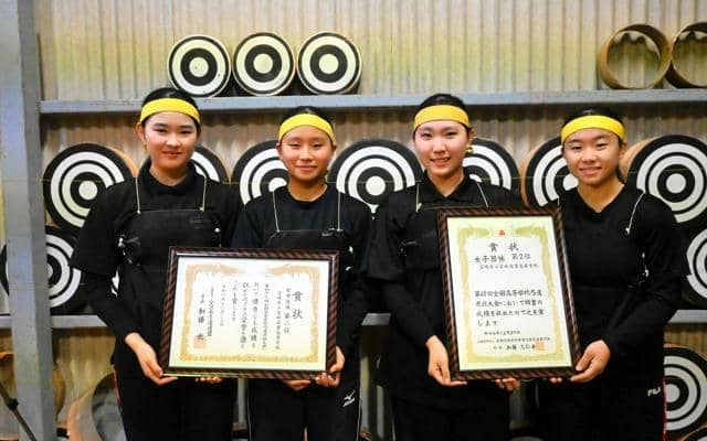 中武さんは「これまでの大会は不安が先行したが、今回は練習するべきことをやり切って臨めた。支援への恩返しの気持ちが練習につながった」と話す。高校から弓道を始めた中村さんは「大会の雰囲気が分かってなくて」予選でうまく的中できず、決勝トーナメントでいったん後輩の浅田優愛さん(1年)に役割を託したが、決勝戦で再び立つと的中させた。「最後はやるしかないと思った」。準優勝はうれしいが、「あと1歩と思うと悔しさもある」と中村さん。