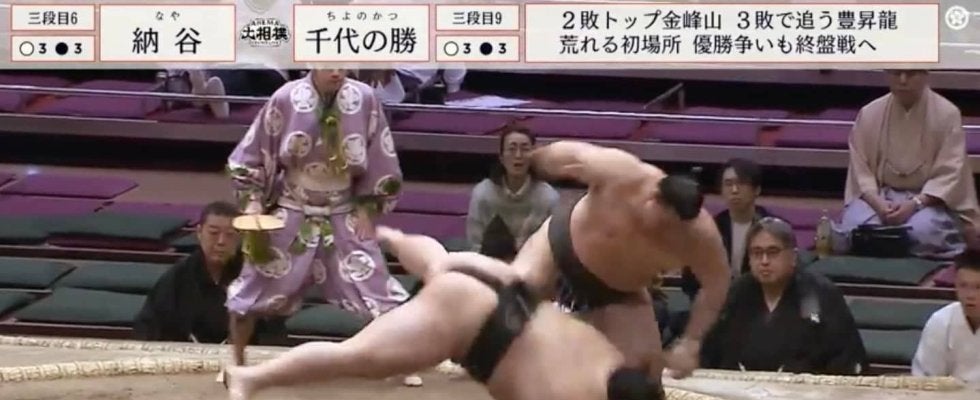 大相撲の取組では力士が指先につけているテーピングを飛ばしてしまったりする場面も稀にあるが、今回のこの光景にも視聴者は「何が飛んだの?」「部品が飛んだ」などと注目していた。なお、千代の勝は4勝目で勝ち越しを決め、一方の納谷は4敗目で負け越しとなった。