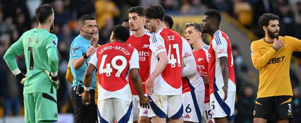 前節アストン・ビラ戦を2-2の引き分けに持ち込まれたアーセナル。首位リバプールを追うべく必勝のウルブス戦に臨んだ中、相手にも好機を許す展開で迎えた43分、DFマイルズ・ルイス=スケリーが相手のカウンターを止めるべくDFマット・ドハーティにファウル。