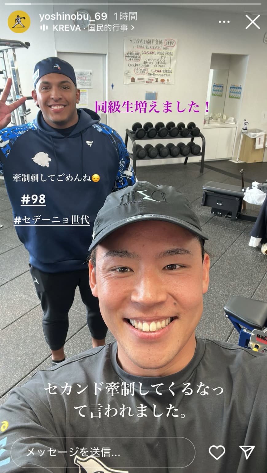 「同級生増えました!」と綴り、写真を投稿。今シーズンから西武に加入した、元オリックスのセデーニョと共に写る様子があった。