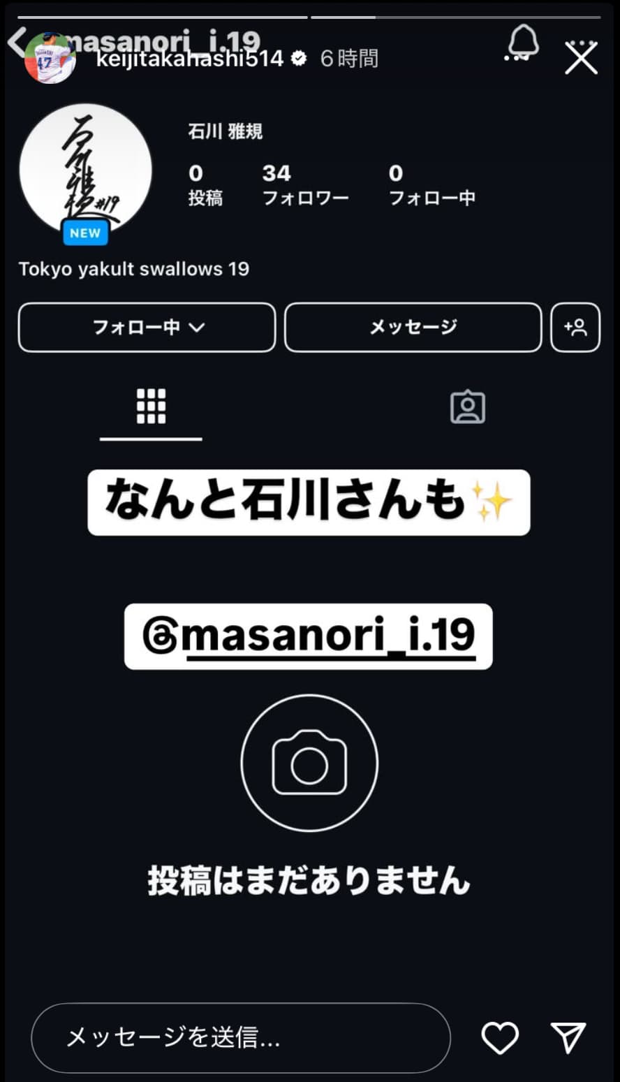 「なんと石川さんも」と綴り、画像を投稿。大先輩の石川雅規がインスタグラムを開設したことを伝えた。
