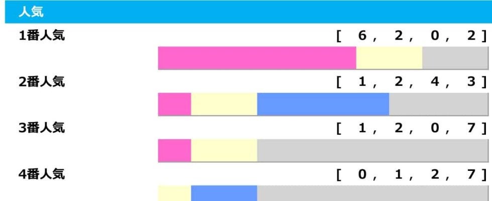 過去10年、1番人気が勝率60.0%、単勝回収値152、複勝率80.0%、複勝回収値104と優秀。2番人気は1勝のみだが、複勝率70.0%、複勝回収値122と、こちらも好成績。3番人気は【1.2.0.7】で、馬券内率こそ上位2頭からガクッと下がるが、連対数は2番人気と変わらない。