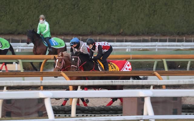 2月11日(祝・火)に船橋競馬場、ダート1800mで行われるクイーン賞。ここに出走を予定しているライオットガール(栗東・中村直也厩舎)とテンカジョウ(栗東・岡田稲男厩舎)の2頭が今朝30日、レースに向けた追い切りを行っている。