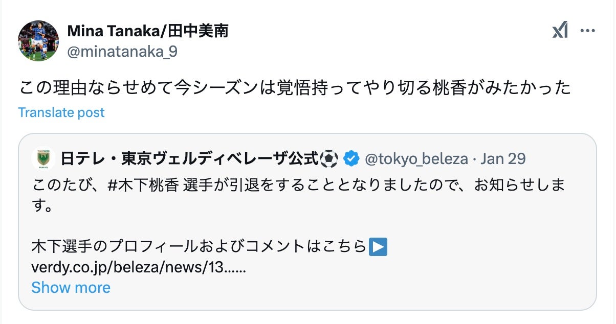 30日、サッカー日本女子代表の田中美南が自身のSNSを更新した。