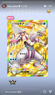 新パック「時空の激闘 パルキア」を開封し、パルキアEXの(クラウンレア)を引き当てたことを報告した。
