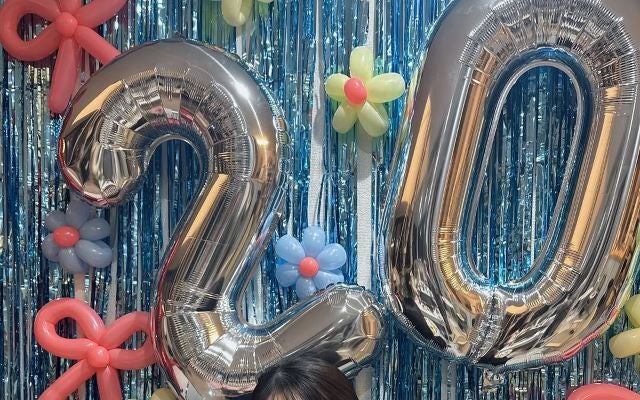 写真には、20の形をした風船の前で写真を撮るかっぱちゃんの姿が。