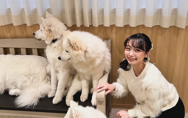 犬カフェと思われる場所で、サモエド犬とお揃い風のモコモコ白トップスをまとい楽しそうな笑顔の安井が可愛すぎると話題になっている。
