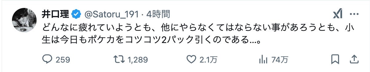 「どんなに疲れていようとも、他にやらなくてはならない事があろうとも、小生は今日もポケカをコツコツ2パック引くのである…。」と綴り、大人気スマホゲームアプリ「ポケポケ」のパック開封を毎日欠かさずに行っていることをポストした。