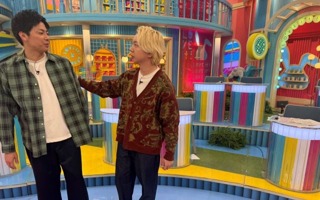 『ラヴィット』を思われる番組セットを背景に、コットンの西村真二と三四郎の相田周二が話している様子を写した一枚だ。