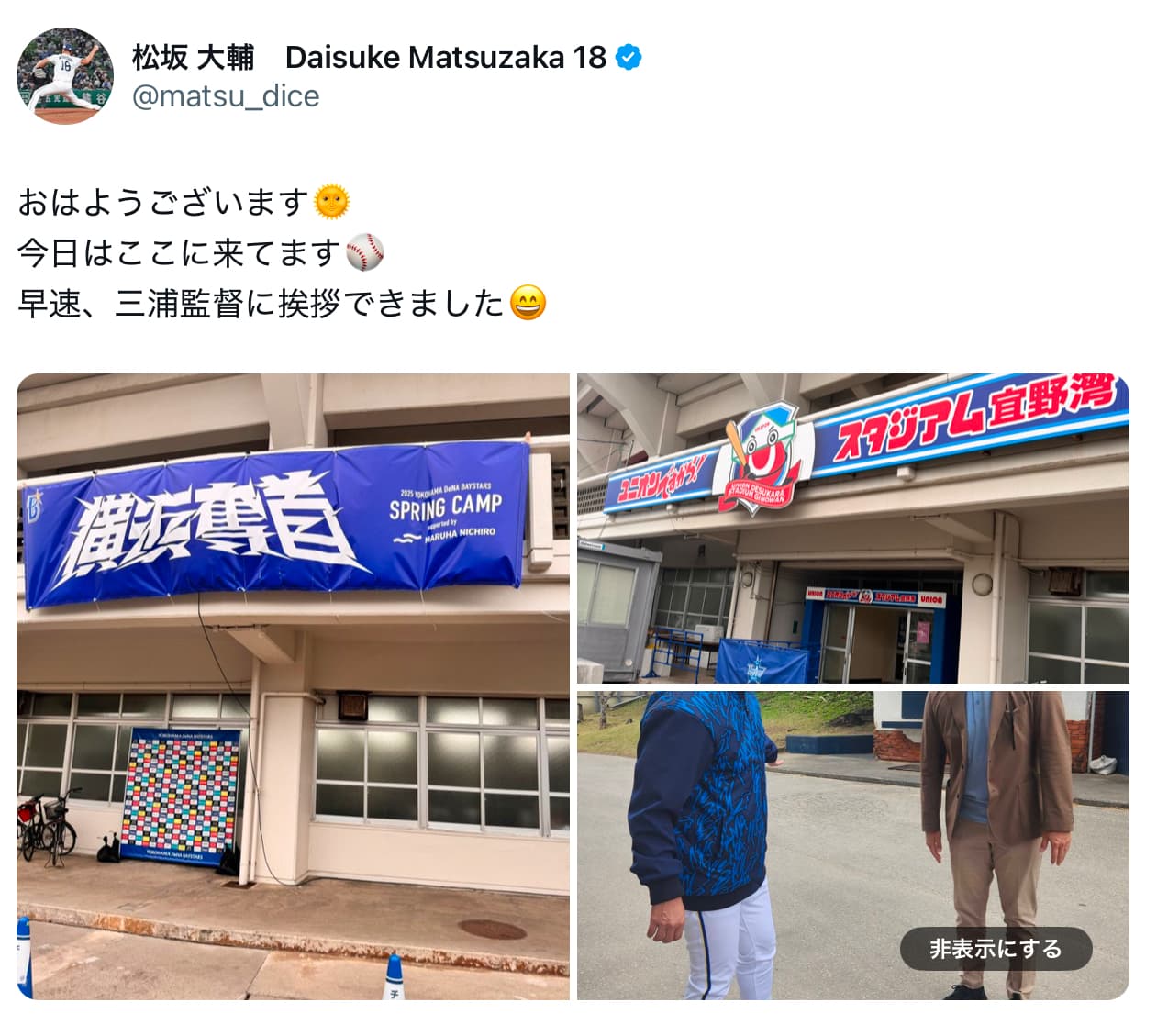 「おはようございます🌞今日はここに来てます⚾️早速、三浦監督に挨拶できました😄」と綴り、写真を投稿。この日行われた、DeNAのキャンプ地を訪問したことを伝えた。