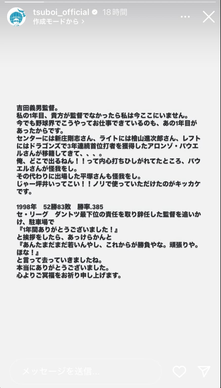 ヤクルトの坪井智哉コーチが5日、自身のインスタグラムのストーリーを更新した。【画像】渡辺謙、元阪神タイガース監督の訃報に…