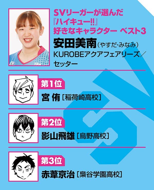 「3位が梟谷学園の赤葦京治、2位が烏野の影山飛雄、1位が稲荷崎の宮侑です。やっぱり、(自分と同じポジションの)セッターに目が行っちゃいます(笑)。
