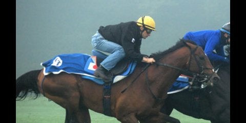 広大なエーグル調教場を覆いつくす朝モヤの中から蹄音が徐々に近づいてくる。霧を切り裂くように、芝コースの上で2頭が馬…