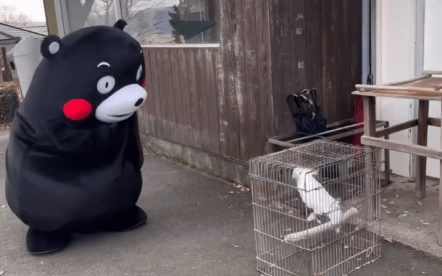 鳥かごに入ったオウムと見られる生物と、まるでお話しでもするかのように見つめ合うくまモンが可愛すぎると話題になっている。