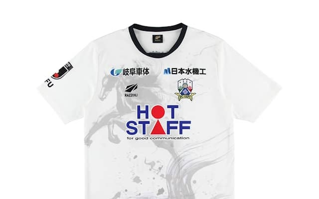 地元・岐阜への思いが詰まった一枚だ。白地に一際目立つ水墨画風に描かれた馬の姿。今季、FC岐阜はオグリキャップを主にアウェイの試合で着用する2ndユニフォームのデザインコンセプトとした。仕掛け人のひとり、営業グループリーダーの東武良さんによると岐阜にまつわる名物を探していたとき、いき着いたのがオグリキャップの存在。主にホームで着用する1stのデザインはクラブカラーの緑を基調としているが、2ndはこれまで「白」を使っておりオグリキャップの芦毛はイメージとあった。さらに同馬が今年で生誕40周年を迎えることも追い風となり、企画を推進した。